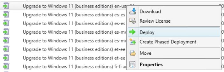 - Right click the appropriate Upgrade to Windows 11 and select Deploy to your appropriate Collection/s. You’ll need to consider how you aim to test the deployment before configuring it for production. See Part 4 of this series for testing recommendations.