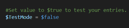 The image above displays a log with a “Test” prefix. This log is generated if the script is configured in Test Mode. Set the boolean value to $True to turn on Test Mode, or $False to disable Test Mode.